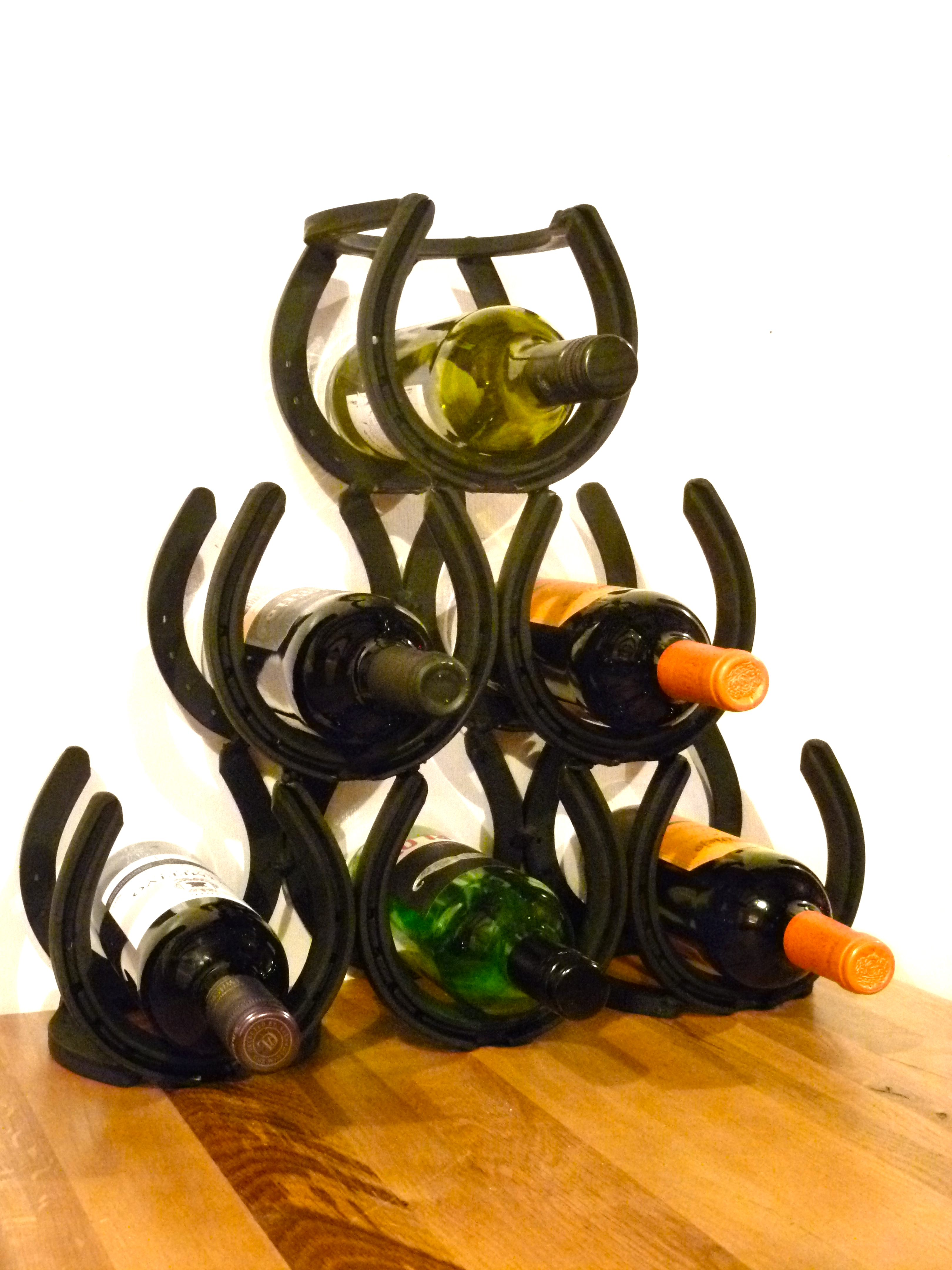 Elegant 6 bottle horseshoe wine rack made from hand selected real horseshoes featuring a pyramid shape that makes the perfect impression.